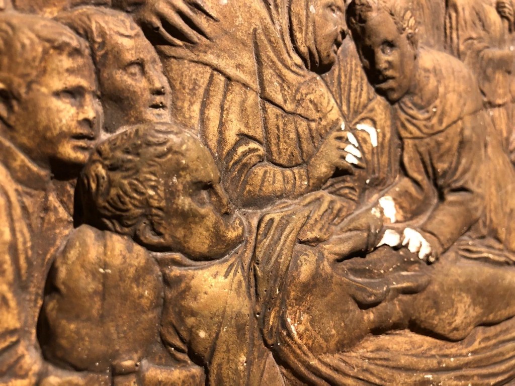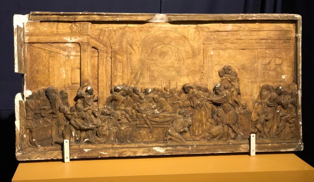 Œuvre particulière de nos collections, son original date de la Renaissance, et est réalisé par Donatello en 1447. Elle représente l’un des treize miracles de Saint Antoine et elle ornait la partie inférieure de l’autel de la Basilique Saint-Antoine de Padoue, avec trois autres plaques. Les quatre miracles sculptés sur cet autel sont : le miracle de la mule, le miracle du nouveau-né qui parle, le miracle du fils repenti et le miracle du cœur de l’avare.