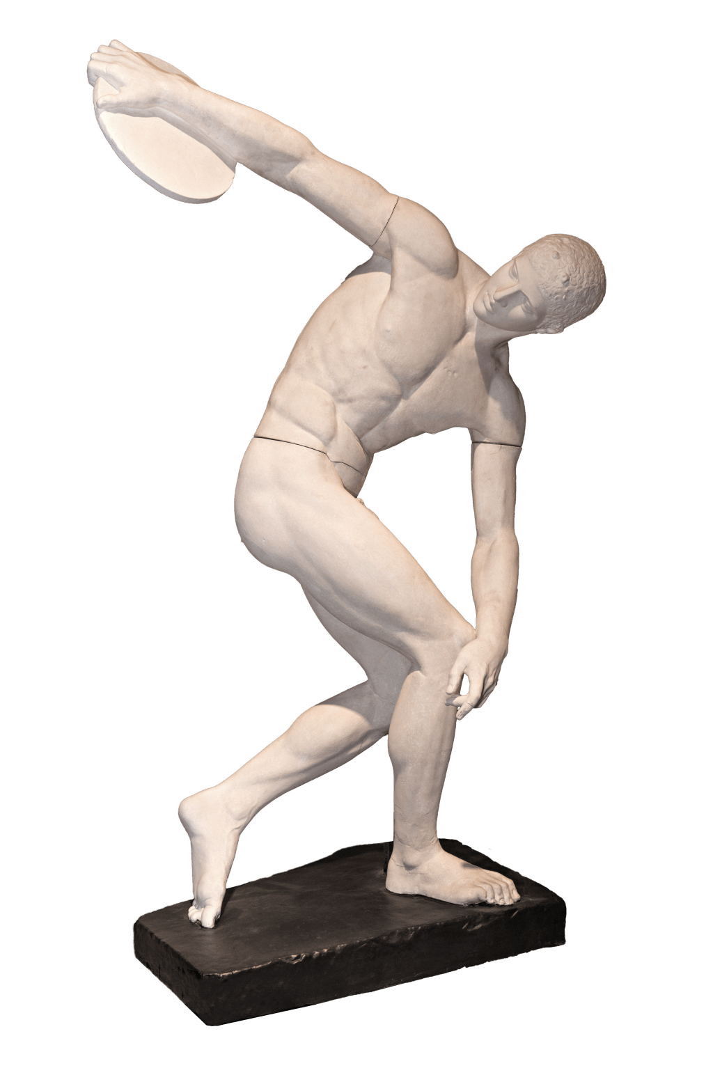 Le Discobole représente un lanceur de disque, discipline appréciée des représentations sportives grecques. Le sport est un thème important pour les sculpteurs, notamment en raison de sa place majeure au sein de l’éducation masculine et de la société. Les sportifs, nus lors de la pratique, permettent aux artistes d’étudier l’anatomie et le mouvement. Myron représente ici la prise d’élan du lanceur avant d’envoyer le disque. Le torse est sculpté de trois quarts avec le bras droit porté vers l’arrière, tenant le disque. La jambe droite porte le poids du corps, la tension musculaire est représentée. La pose s’inscrit dans une composition en triangle, peu naturelle en raison de l’espace étroit dans lequel le corps se trouve. Elle est principalement faite pour être observée de face afin de voir l’ensemble du mouvement et la tension du corps.