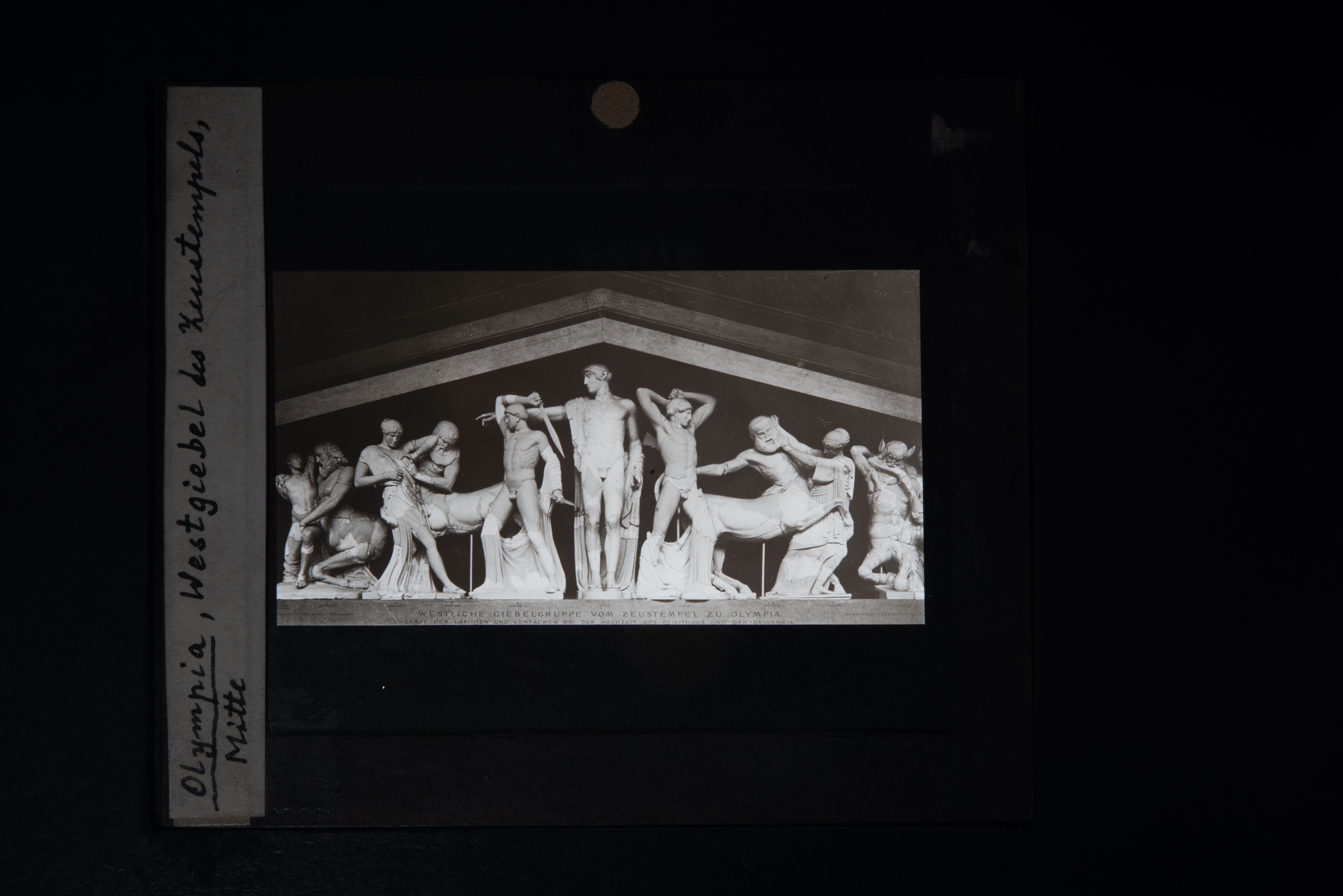 Restitution du fronton ouest du temple de Zeus, illustrant la centauromachie